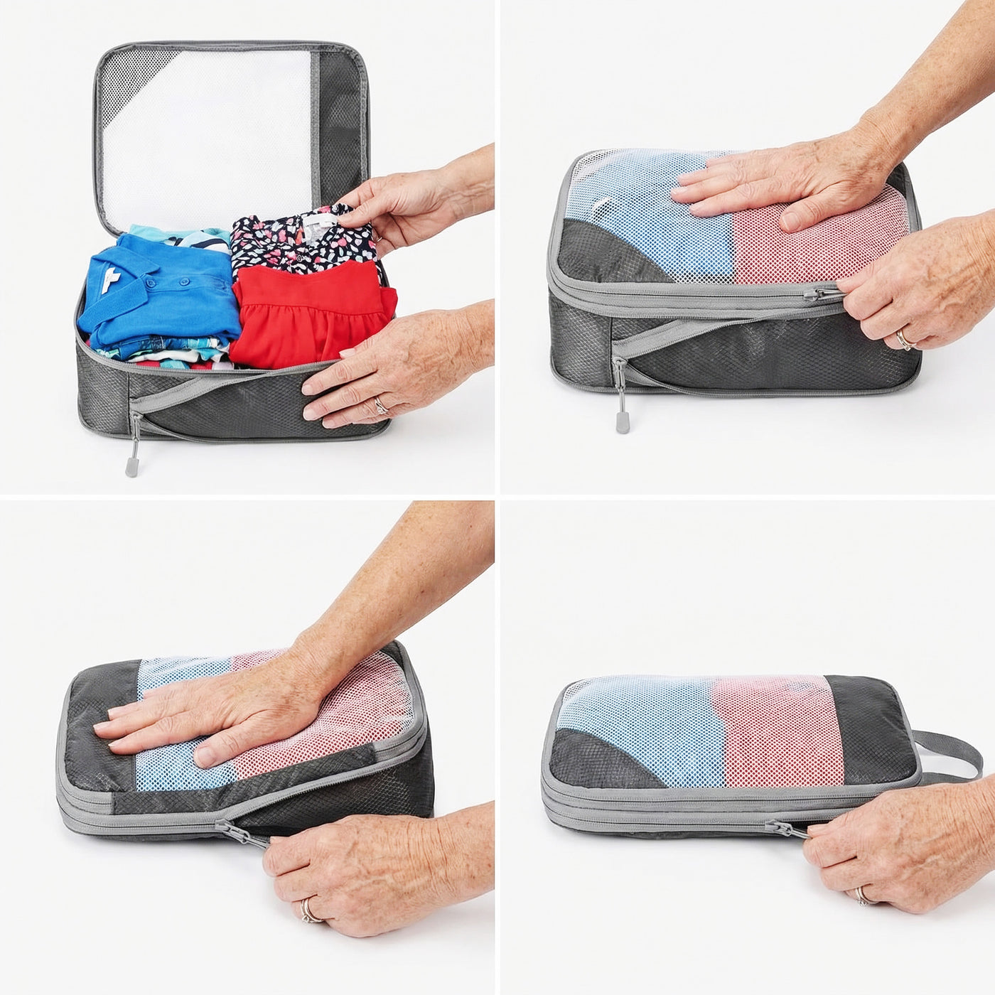 Dank der 2-Stufen-Kompression holst du bis zu 50 % mehr Platz aus deinem Koffer — ohne Stopfen oder Sitzen.